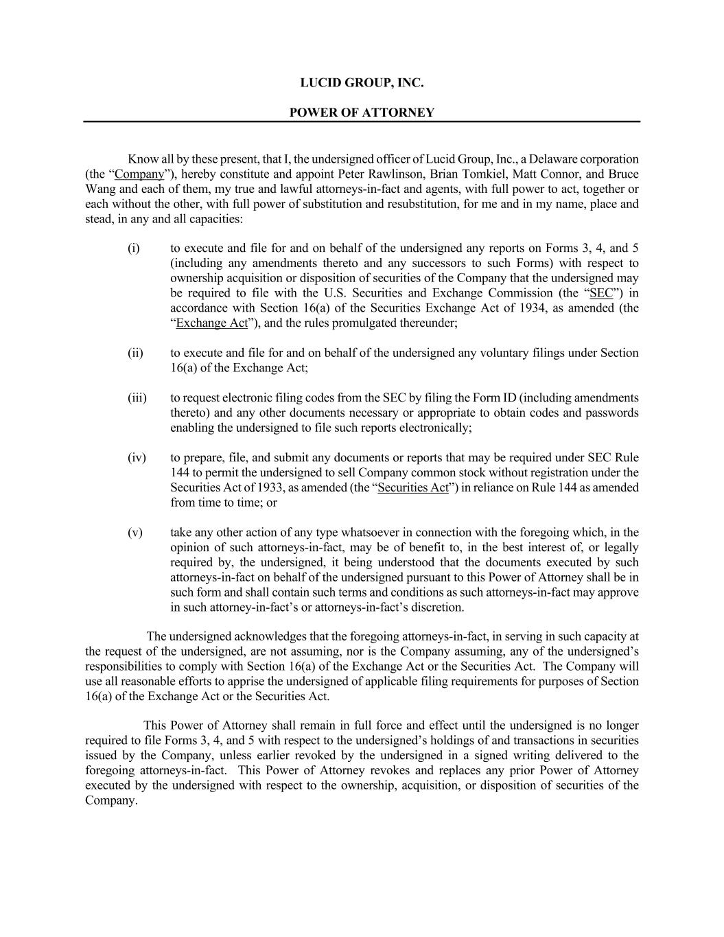 LUCID GROUP, INC. POWER OF ATTORNEY Know all by these present, that I, the undersigned officer of Lucid Group, Inc., a Delaware corporation (the “Company”), hereby constitute and appoint Peter Rawlinson, Brian Tomkiel, Matt Connor, and Bruce Wang and each of them, my true and lawful attorneys-in-fact and agents, with full power to act, together or each without the other, with full power of substitution and resubstitution, for me and in my name, place and stead, in any and all capacities: (i) to execute and file for and on behalf of the undersigned any reports on Forms 3, 4, and 5 (including any amendments thereto and any successors to such Forms) with respect to ownership acquisition or disposition of securities of the Company that the undersigned may be required to file with the U.S. Securities and Exchange Commission (the “SEC”) in accordance with Section 16(a) of the Securities Exchange Act of 1934, as amended (the “Exchange Act”), and the rules promulgated thereunder; (ii) to execute and file for and on behalf of the undersigned any voluntary filings under Section 16(a) of the Exchange Act; (iii) to request electronic filing codes from the SEC by filing the Form ID (including amendments thereto) and any other documents necessary or appropriate to obtain codes and passwords enabling the undersigned to file such reports electronically; (iv) to prepare, file, and submit any documents or reports that may be required under SEC Rule 144 to permit the undersigned to sell Company common stock without registration under the Securities Act of 1933, as amended (the “Securities Act”) in reliance on Rule 144 as amended from time to time; or (v) take any other action of any type whatsoever in connection with the foregoing which, in the opinion of such attorneys-in-fact, may be of benefit to, in the best interest of, or legally required by, the undersigned, it being understood that the documents executed by such attorneys-in-fact on behalf of the undersigned pursuant to this Power of Attorney shall be in such form and shall contain such terms and conditions as such attorneys-in-fact may approve in such attorney-in-fact’s or attorneys-in-fact’s discretion. The undersigned acknowledges that the foregoing attorneys-in-fact, in serving in such capacity at the request of the undersigned, are not assuming, nor is the Company assuming, any of the undersigned’s responsibilities to comply with Section 16(a) of the Exchange Act or the Securities Act. The Company will use all reasonable efforts to apprise the undersigned of applicable filing requirements for purposes of Section 16(a) of the Exchange Act or the Securities Act. This Power of Attorney shall remain in full force and effect until the undersigned is no longer required to file Forms 3, 4, and 5 with respect to the undersigned’s holdings of and transactions in securities issued by the Company, unless earlier revoked by the undersigned in a signed writing delivered to the foregoing attorneys-in-fact. This Power of Attorney revokes and replaces any prior Power of Attorney executed by the undersigned with respect to the ownership, acquisition, or disposition of securities of the Company.
